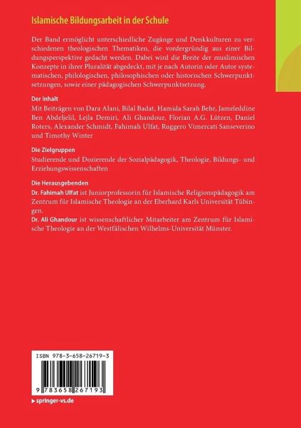 Quellen: Mit dem Koran in den Islamischen Religionsunterricht.- Mit dem Hadith in den Islamischen Religionsunterricht.- Grundfragen : Mit Adam in den Islamischen Religionsunterricht. (Kreationismus, Schöpfung, Evolution.- Mit Muhammad in den Islamischen Religionsunterricht.- Mit Jesus und Maria(m) in den in den Islamischen Religionsunterricht.- Die emotionale Dimension des Religionsunterrichts: Mit dem Tasawwuf in den Islamischen Religionsunterricht.- Mit dem sehenden Herzen in den Islamischen Religionsunterricht.- Mit der Kraft der Narrationen in den Islamischen Religionsunterricht. Allegorese.- Lebenspraxis: Mit der Scharia in den Islamischen Religionsunterricht.- Mit Theologie und Politik in den Islamischen Religionsunterricht.- Medien: Mit Bildern in den Islamischen Religionsunterricht.- Mit Videospielen in den Islamischen Religionsunterricht.- Grenzfragen: Mit der Frage nach dem Bösen in den Islamischen Religionsunterricht.- Mit dem Jenseits in den Islamischen Religionsunterricht.- The Question of Evil.