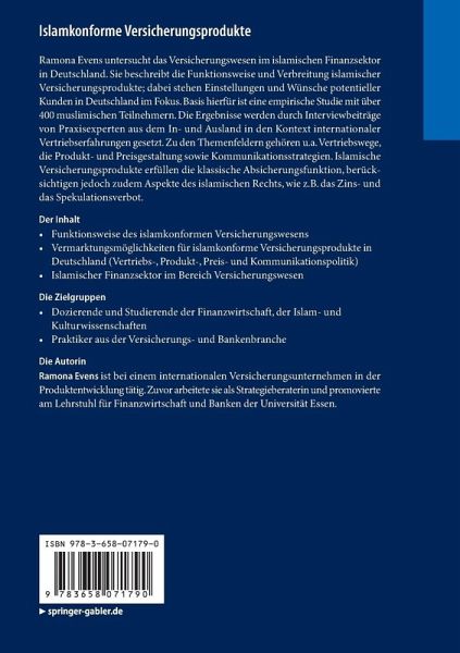 Ramona Evens untersucht das Versicherungswesen im islamischen Finanzsektor in Deutschland. Sie beschreibt die Funktionsweise und Verbreitung islamischer Versicherungsprodukte; dabei stehen Einstellungen und Wünsche potentieller Kunden in Deutschland im Fokus. Basis hierfür ist eine empirische Studie mit über 400 muslimischen Teilnehmern. Die Ergebnisse werden durch Interviewbeiträge von Praxisexperten aus dem In- und Ausland in den Kontext internationaler Vertriebserfahrungen gesetzt. Zu den Themenfeldern gehören u.a. Vertriebswege, die Produkt- und Preisgestaltung sowie Kommunikationsstrategien. Islamische Versicherungsprodukte erfüllen die klassische Absicherungsfunktion, berücksichtigen jedoch zudem Aspekte des islamischen Rechts, wie z.B. das Zins- und das Spekulationsverbot.