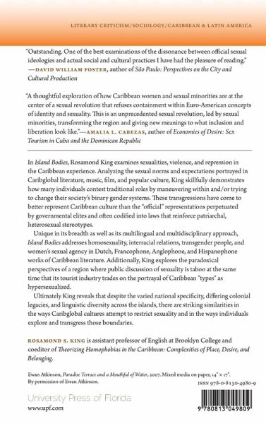 In Island Bodies, Rosamond King examines sexualities, violence, and repression in the Caribbean experience. She analyses the sexual norms and expectations portrayed in Caribbean and diaspora litera¬ture, music, film, and popular culture to show how many individuals contest traditional roles by manoeuvring within and/or trying to change their society’s binary gender systems. She skilfully demon¬strates that these transgressions better represent Caribbean culture than the “official” representations perpetuated by governmental elites and often codified into laws that reinforce patriarchal, hetero¬sexual stereotypes. Unique in its breadth and its multilingual and multidisciplinary approach, Island Bodies addresses homosexuality, interracial rela¬tions, transgender people, and women’s sexual agency in Dutch, Francophone, Anglophone, and Hispanophone works of Caribbean literature. Ultimately King reveals that despite the varied national specificity, differing colonial legacies, and linguistic diversity across the islands, there are striking similarities in the ways Caribglobal cultures at¬tempt to restrict sexuality and in the ways individuals explore and transgress those boundaries.