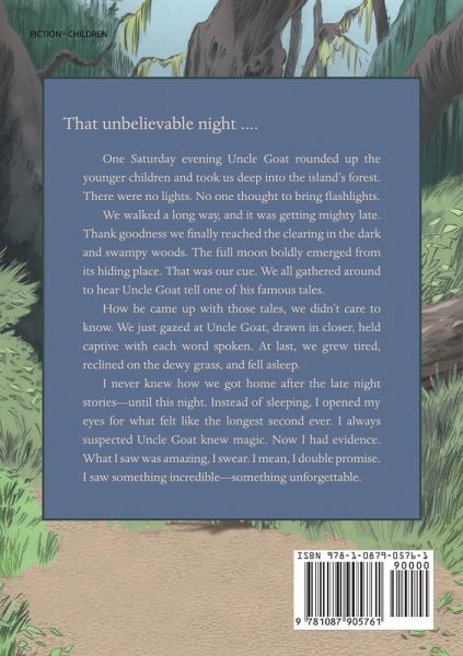 That unbelievable night .... Once the other preteens and I gathered together, Uncle Goat did what he normally did; he took us deep into the island's forest. The forest was pitch-black, blacker than black! We couldn't see five feet in front of us. No one lit a torch, and no one had thought to bring a flashlight. Somehow, Uncle Goat knew where he was taking us. I suspected he could get there with his eyes closed. We wandered through the swampy woods, using gators as stepping-stones and snakes as ropes to cross small streams and ponds. Now the gators and snakes didn't bother us much. We ate them, but those darn black bears were scary! Thank goodness Uncle Goat wasn't a coward. He sniffed the air like a hound dog to locate the black bears around us. Once he knew their whereabouts ... "Now listen here, darn black bears!" Uncle Goat shouted. "If y'all know like I know, you would mosey on out of the way. Otherwise, one of you will end up being a rug resting beneath my feet tonight. So back the heck up. Do you hear me!" Slowly but surely, the black bears backed away. They didn't dare cross our path after Uncle Goat's taunting. But we heard their heavy breathing and saw their beady eyes in the blacker-than-black forest night. We walked a long way, and it was getting mighty late. Thank goodness we finally reached the clearing in the dark and swampy woods. The full moon boldly emerged from its hiding place. That was our cue. We all gathered around to hear Uncle Goat tell one of his famous tales. How he came up with those tales, we didn't care to know. We just gazed at Uncle Goat, drawn in closer, held captive with each word spoken. At last we grew tired, lay down on the dewy grass, and fell asleep. I never knew how we got home after the late-night stories. Until this night. Instead of sleeping, I opened my eyes for what felt like the longest second ever. I always suspected Uncle Goat knew magic. Now I had evidence. What I saw was amazing. I swear. I mean, I double promise. I saw something incredible...something un-for-get-a-ble!