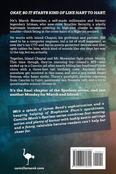 Okay, so it starts kind of like Hart to Hart. He's March November, a self-made millionaire and former legendary hitman, who now runs Struthio Security, a wholly legitimate business catering to high-end clients in serious trouble-think being in the cross-hairs of a Nigerian warlord. He works with Island Chaptal, his girlfriend and partner. She used to be a computer engineer, but a lot of stuff happened, so now she's his CTO and hacks poorly-protected devices and fiber optic cables for him, which kind of sounds like she slept her way to the top, but no, actually. Together, Island Chaptal and Mr. November fight crime. Mostly. This time though, they're rescuing Joy-Island's BFF-who ended up in a Cancún jail after nearly killing her boyfriend's side chica with a three-feet tall birthday cake. Ancient aliens somehow get involved in this mess, and also a guy name Angel Somoza, who hates sloths. There's gunfights, frenetic capering from Cancún to Cairo, passionate sex, Roomba cats, and a lot of questionable science thrown in. It's the final chapter of the Spotless series, and just another Monday for March and Island.