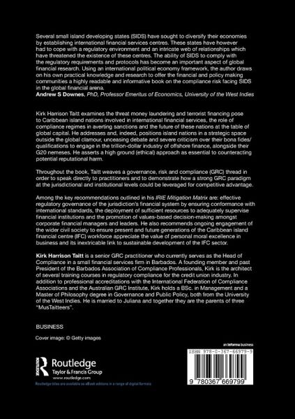 Kirk Harrison Taitt examines the threat money laundering and terrorist financing pose to Caribbean island nations involved in international financial services, the role of compliance regimes in averting sanctions and the future of these nations at the table of global capital. He addresses and, indeed, positions island nations in a strategic space outside the global clamour, unceasing debate and severe criticism over their bona-fides/qualifications to engage in the trillion-dollar industry of offshore finance, alongside their G20 nemeses. He asserts a high ground (ethical) approach as essential to counteracting potential reputational harm. Throughout the book, Taitt weaves a governance, risk and compliance (GRC) thread in order to speak directly to practitioners and to demonstrate how a strong GRC paradigm at the jurisdictional and institutional levels could be leveraged for competitive advantage. Among the key recommendations outlined in his IRIE Mitigation Matrix are: effective regulatory governance of the jurisdiction's financial system by ensuring conformance with international standards, the deployment of sufficient resources to adequately supervise financial institutions and the promotion of values-based decision-making amongst corporate financial managers and leaders. He also recommends on-going engagement of the wider civil society to ensure present and future generations of the Caribbean island financial centre (IFC) workforce appreciate the value of personal moral excellence in business and its inextricable link to sustainable development of the IFC sector.