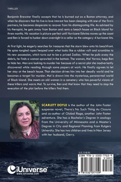 Benjamin Brewster finally accepts that he is burned out as a Boston attorney, and when he discovers that his live-in love interest has been sleeping with one of the firm's partners, he becomes desperate to recover from his disintegrating life. As advised by his therapist, he gets away from Boston and rents a beach house on Block Island for three months. His vacation is picture-perfect until Hurricane Edwina moves up the coast and Ben is forced to hunker down overnight in a cellar as the category 4 hurricane hits. At first light, he eagerly searches for treasures that the storm blew onto his beachfront. He spies tangled ropes heaped over what looks like a rubber raft and scrambles to his new possession, which turns out to be a prized Zodiac. When he pulls away the debris, he finds a woman sprawled in the bottom. The woman, Mel Yarrow, begs Ben to hide her. Men are looking to murder her because of a secret plot she inadvertently discovered while reading through some papers at work. He finally agrees to let her stay at the beach house. That decision drives him into her deadly world and he becomes a target for murder. Mel is drawn into the mysterious, paranormal world of Block Island. She meets an old woman in a cemetery who has powerful visions of these killers and warns Mel. To survive, Ben and Mel know that they need to stop the execution of the plot before the killers find them.