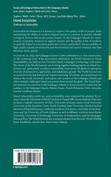 Foreword (Ashlan Cousteau).- Preface (Don Hobart).- Part I: UNC & USFQ Galapagos Science Center, 10th Year Anniversary.- Chapter 1. Connected Places and Social-Ecological Forces that Impact Small Island Sustainability: An Essay (Stephen J. Walsh and Carlos F. Mena).- Part II: Communique of the World Summit on Island Sustainability.- Chapter 2. Goals and Objectives of the World Summit on Island Sustainability (Stephen J. Walsh and Carlos F. Mena).- Part III: Island Ecosystems - Challenges to Sustainability.- Chapter 3. Globalization and the Challenging Political Economy of Governing (and Researching) Islands in Contemporary Times (Juan Pablo Luna).- Chapter 4. Changing Land Use in Island Countries: A Meta Perspective on Effects of Demographic Processes and Tourism (Richard E. Bilsborrow).- Chapter 5. Pacific Island Perspectives on Invasive Species and Climate Change (Laura Brewington, Bradley Eichelberger, Nicole Read, Elliott Parsons, Heather Kerkering, Christy Martin, Wendy Miles, Jacques Idechong, Jeff Burgett).- Chapter 6. On-the-Ground Solutions to Help People and Wildlife in a Changing Climate (Nikhil Advani).- Part IV: Island Ecosystems - Social Sub-Systems.- Chapter 7. Climate and Health Challenges in Small Island States: Identifying Vulnerability in Water and Food Resources in the Galapagos Islands, Ecuador (Amanda L. Thompson, Jill Stewart, Margaret Bentley, Jaime Ocampo, Enrique Teran and Valeria Ochoa).- Chapter 8. Improvements in the Galapagos Health System: Telemedicine, Research, and Medical Assistants (Jaime Eduardo Ocampo Trujillo and María Emilia Menoscal Coello).- Chapter 9. Social Issues in the Galapagos Islands: A Participatory and Exploratory Study (Gina Chowa, Cindy Fraga Rizzo, Amanda Thompson, Margaret Bentley and Mimi Chapman).- Chapter 10. Towards Increased Island Food System Resilience: Lessons Learned from the COVID-19 Pandemic (Khristopher M. Nicholas, Margaret E. Bentley, Clare Barrington and Amanda L. Thompson).- Chapter 11. Understanding the Impacts of a Natural Disaster: Evidence from the 2004 Indian Ocean Tsunami (Elizabeth Frankenberg, Cecep Sumantri and Duncan Thomas).- Part V: Island Ecosystems - Terrestrial Sub-Systems.- Chapter 12. Unraveling the Interactions between Endemic and Invasive Plant Species in the Galapagos Islands (María de Lourdes Torres, Diego Urquía, Leonie Moyle, Matt Gibson, Todd Vision and Bryan Reatini).- Chapter 13. Galapagos Land Snails and Environmental Sustainability (Stella de la Torre & Isabel Villarruel-Oviedo).- Chapter 14. Galapagos Petrels Conservation Helps Transition Towards a Sustainable Future (Leo Zurita Arthos, Carolina Proaño, Jonathan Guillén, Sebastián Cruz and David Wiedenfeld).- Chapter 15. Impact of Weathering and Mineralogy on the Chemistry of Soils from San Cristobal Island, Galapagos (Xiao-Ming Liu, Heather D. Hanna and Julia G. Barzyk).- Chapter 16. Mapping Narratives of Agricultural Land Use Practices in the Galapagos (Francisco Laso & Javier Arce-Nazario).- Chapter 17. Land Use and Land Cover Change: Economic and Natural Drivers (Madeline Giefer).- Part VI: Island Ecosystems - Marine Sub-Systems.- Chapter 18. Common Oversights in the Design and Monitoring of Ecosystem-Based Management Plans and the Siting of Marine Protected Areas (Sergio A. Navarrete, Christopher M. Aiken, M. Isidora Ávila-Thieme, Daniel Valencia, Alexandre Génin and Stefan Gelcich).- Chapter 19. Levels of Upwelling are Important to Consider for Conservation (Michael J Kingsford, Margarita Brandt and Juan-Manuel Alava).- Chapter 20. Ten Years of Wildlife Health and Conservation in the Galapagos, 2013-2022 (Gregory A. Lewbart, Juan Pablo Muñoz-Pérez, Diego Páez-Rosas, Carlos Valle, Daniela Alarcón Ruales Maximilian Hirschfeld, Diane Deresienski and Kenneth J. Lohmann).- Chapter 21. Challenges in the Application of the Ecosystem Approach to Fisheries Management in the Galapagos Islands (Marjorie Riofrio-Lazo, Manuel J. Zetina-Rejón, Gunter Reck, Diego Páez-Rosas and Francisco Arreguín-Sánchez).- Chapter 22. Cetaceans of the Galapagos Archipelago: Species in Constant Change and the Importance of a Standardized and Long-Term Citizen Science (Daniela Alarcón-Ruales, Judith Denkinger, Leo Zurita, Salome Herrera C, Santiago Díaz-Pazmiño, Eduardo Espinoza; Juan Pablo Muñoz-Pérez; Bonnie Holmes; Kathy A. Townsend).- Chapter 23. Establishing Comparable Health Baselines for Marine Turtle Populations (Caitlin E. Smith, Ben L. Gilby, Juan Pablo Muñoz-Pérez, Jason P. van de Merwe, Kathy A. Townsend).- Part VII: Island Ecosystems - Interdisciplinary Science for Sustainability.- Chapter 24. An Agent-Based Model of Household Livelihood Strategies in the Galapagos Islands: Impact of Jobs in Fishing, Fishing Restrictions, and Fishing Deregulation on Household Employment Decisions (Stephen J. Walsh & Carlos F. Mena).- Chapter 25. The Role for Scientific Collections and Public Museums in Island Conservation (John Dumbacher and Jaime Chaves).- Chapter 26. The Museum Effect: Platforms for Advocacy and Sustainability in Insular Environments (Eric Dorfman, Javan Sutton, and Bryan L. Stuart).- Chapter 27. Microgrids: An Opportunity for Sustainable Developments on Islands (Noah Kittner).- Part VIII: Island Sustainability: Paths Forward in the Galapagos & Beyond.- Chapter 28. Island Digital Ecosystem Avatars (IDEA) Consortium: Infrastructure for Democratic Ecological Action (Neil Davies).- Chapter 29. Galapagos Genetic Barcode: A Model for Island Economic Resilience During COVID-19 Pandemic (Jaime A. Chaves, Camille Bonneaud, Andy Russell, Carlos F. Mena, Carolina Proano, Diego A. Ortiz, Marilyn Cruz, Alberto Velez, Jen Jones, Tom Chaigneau and Diana A. Pazmino).- Chapter 30. Island Innovation: Transitioning Towards a Circular Economy for Plastics in Galapagos, Ecuador (Jen S. Jones, Jess Howard, Tamara S. Galloway, Lucía Norris and Sol Espinosa).- Chapter 31. From Building Resilience to Adaptive Transformation: Exploring the Rationale for