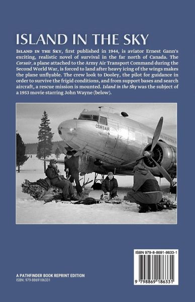 Island in the Sky, first published in 1944, is aviator Ernest Gann's exciting, realistic novel of survival in the far north of Canada. The Corsair, a plane attached to the Army Air Transport Command during the Second World War, is forced to land after heavy icing of the wings makes the plane unflyable. The crew look to Dooley, the pilot for guidance in order to survive the frigid conditions, and from support bases and search aircraft, a rescue mission is mounted. Island in the Sky was the subject of a 1953 movie starring John Wayne.