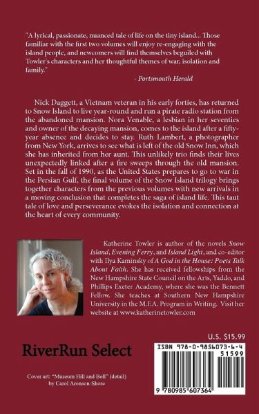 Nick Daggett, a Vietnam veteran in his early forties, has returned to Snow Island to live year-round and run a pirate radio station from the abandoned mansion. Nora Venable, a lesbian in her seventies and owner of the decaying mansion, comes to the island after a fifty-year absence and decides to stay. Ruth Lambert, a photographer from New York, arrives to see what is left of the old Snow Inn, which she has inherited from her aunt. This unlikely trio finds their lives unexpectedly linked after a fire sweeps through the old mansion. Set in the fall of 1990, as the United States prepares to go to war in the Persian Gulf, the final volume of the Snow Island trilogy (after Snow Island and Evening Ferry) brings together characters from the previous volumes with new arrivals in a moving conclusion that completes the saga of island life. This taut tale of love and perseverance evokes the isolation and connection at the heart of every community.