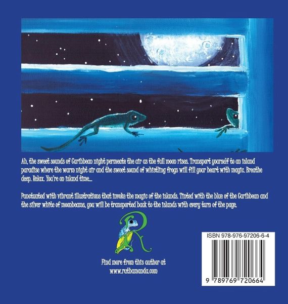 Ah, the sweet sounds of Caribbean night permeate the air as the full moon rises. Doves coo. Whistling frogs...well...whistle. Fairies dance in the frothy waves and so much more. Transport yourself to an island paradise where the warm night air will fill your heart with magic. Breathe deep. Relax. You're on island time...Punctuated with vibrant illustrations that invoke the magic of the islands. Tinted with the blue of the Caribbean and the silver white of moonbeams, you will be transported back to the islands with every turn of the page. The author has created another bit of magic to read with your littles or just enjoy. The illustrations almost turn this book into a coffee table book and are so unique compared to her usual style. More than a children's picture book, this is a lesson in simple art appreciation. From the creator of Geckos in the Garden, Ess-Car-Go! , Puffin Lullaby, and more, this book contains Ruth Amanda's signature magic with a strikingly unique twist on her illustration style using the vibrance of acrylics on canvas to create images that evoke the warmth and blueness of the Caribbean at night.