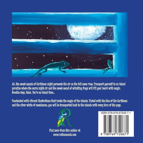 Ah, the sweet sounds of Caribbean night permeate the air as the full moon rises. Doves coo. Whistling frogs...well...whistle. Fairies dance in the frothy waves and so much more. Transport yourself to an island paradise where the warm night air will fill your heart with magic. Breathe deep. Relax. You're on island time...Punctuated with vibrant illustrations that invoke the magic of the islands. Tinted with the blue of the Caribbean and the silver white of moonbeams, you will be transported back to the islands with every turn of the page. The author has created another bit of magic to read with your littles or just enjoy. The illustrations almost turn this book into a coffee table book and are so unique compared to her usual style. More than a children's picture book, this is a lesson in simple art appreciation. From the creator of Geckos in the Garden, Ess-Car-Go! , Puffin Lullaby, and more, this book contains Ruth Amanda's signature magic with a strikingly unique twist on her illustration style using the vibrance of acrylics on canvas to create images that evoke the warmth and blueness of the Caribbean at night.