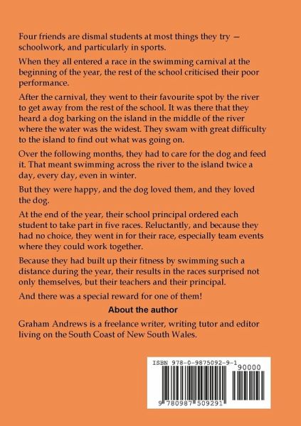 Four friends are dismal students at most things they try - schoolwork, and particularly sports. When they all entered a race in the swimming carnival at the beginning of the year, the rest of the children criticised their poor performance. They went to their favourite spot by the river to get away from the rest of the school. It was there that they heard a dog barking on the island in the middle of the river where the water was the widest. They swam with great difficulty to the island to find out what was going on. They had to care for the dog and feed it. That meant swimming across the river to the island twice a day, every day, even in winter.