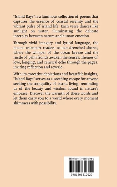 "Island Rays" is a luminous collection of poems that captures the essence of coastal serenity and the vibrant pulse of island life. Each verse dances like sunlight on water, illuminating the delicate interplay between nature and human emotion. Through vivid imagery and lyrical language, the poems transport readers to sun-drenched shores, where the whisper of the ocean breeze and the rustle of palm fronds awaken the senses. Themes of love, longing, and renewal echo through the pages, inviting reflection and reverie. With its evocative depictions and heartfelt insights, "Island Rays" serves as a soothing escape for anyone seeking the tranquility of island living, reminding us of the beauty and wisdom found in nature's embrace. Discover the warmth of these words and let them carry you to a world where every moment shimmers with possibility.