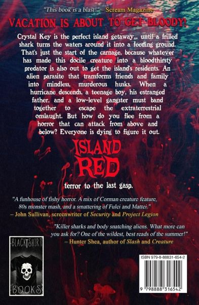 VACATION IS ABOUT TO GET BLOODY! Crystal Key is the perfect island getaway... until a frilled shark turns the waters around it into a feeding ground. That's just the start of the carnage, because whatever has made this docile creature into a bloodthirsty predator is also out to get the island's residents. An alien parasite that transforms friends and family into mindless, murderous husks. When a hurricane descends, a teenage boy, his estranged father, and a low-level gangster must band together to escape the extraterrestrial onslaught. But how do you flee from a horror that can attack from above and below? Everyone is dying to figure it out. ISLAND RED -- terror to the last gasp.