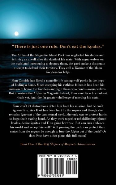 "There is just one rule. Don't. Eat. The koalas." The Alpha of the Magnetic Island Pack has neglected his duties and is living as a wolf after the death of his mate. With rogue wolves on the mainland threatening to destroy them, the pack make a desperate attempt to defend their territory. They call a Warrior of the Moon Goddess for help. Finn Cassidy has lived a nomadic life saving wolf packs in the hope of finding a home. Since escaping his ruthless father, it has been his mission to honor the Goddess and fight those who don't-rogue wolves. But to restore the Alpha on Magnetic Island, Finn must face his darkest rivals yet. And the far greater challenge of meeting his mate. Finn won't let distractions deter him from his mission, but he can't ignore Fate. Ava Hart has been hurt by the rogues and though she remains ignorant of the paranormal world, the only way to protect her is to forge their mating bond. As they work together rehabilitating injured koalas, desire ignites and Finn gains her trust. But can Ava embrace his world and accept his wolf? Will proving the pack can protect their mates from the rogues be enough to lure the Alpha out of the bush? Or does Fate have other plans this full moon?