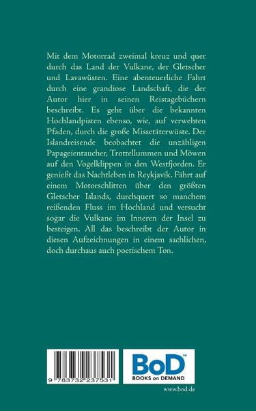 Mit dem Motorrad zweimal kreuz und quer durch das Land der Vulkane, der Gletscher und Lavawüsten. Eine abenteuerliche Fahrt durch eine grandiose Landschaft, die der Autor hier in seinen Reistagebüchern beschreibt. Es geht über die bekannten Hochlandpisten ebenso, wie, auf verwehten Pfaden, durch die große Missetäterwüste. Der Islandreisende beobachtet die unzähligen Papageientaucher, Trottellummen und Möwen auf den Vogelklippen in den Westfjorden. Er genießt das Nachtleben in Reykjavik. Fährt auf einem Motorschlitten über den größten Gletscher Islands, durchquert so manchem reißenden Fluss im Hochland und versucht sogar die Vulkane im Inneren der Insel zu besteigen. All das beschreibt der Autor in diesen Aufzeichnungen in einem sachlichen, doch durchaus auch poetischem Ton.