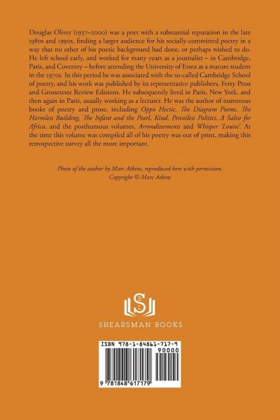 Douglas Oliver (1937–2000) was a poet with a substantial reputation in the late 1980s and 1990s, finding a larger audience for his socially-committed poetry in a way that no other of his poetic background had done, or perhaps wished to do. He left school early, and worked for many years as a journalist – in Cambridge, Paris, and Coventry – before attending the University of Essex as a mature student in the 1970s. In this period he was associated with the so-called Cambridge School of poetry, and his work was published by its representative publishers, Ferry Press and Grosseteste Review Editions. He subsequently lived in Paris, New York, and then again in Paris, usually working as a lecturer. He was the author of numerous books of poetry and prose, including Oppo Hectic, The Diagram Poems, The Harmless Building, The Infant and the Pearl, Kind, Penniless Politics, A Salvo for Africa, and the posthumous volumes, Arrondissements and Whisper ‘Louise’. At the time this volume was compiled all of his poetry was out of print, making this retrospective survey all the more important.
