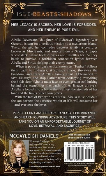 HER LEGACY IS SACRED, HER LOVE IS FORBIDDEN, AND HER ENEMY IS PURE EVIL. Airella Devereaux, daughter of Eldaraya's legendary War General, is sent on a perilous mission to a mysterious island. There, she and her comrades discover terrifying creatures known as Miscreants, and among them is Sirius, a reaper whose dark nature both intrigues and unsettles her. As they battle to survive, a forbidden connection ignites between Airella and Sirius, defying their enemy status. When a powerful dark entity known as "Father" follows them back to Eldaraya, it spreads chaos, threatens the kingdom, and tears Airella's family apart. Determined to save Eldaraya and stop Father from destroying everything she holds dear, Airella must face an even greater evil lurking behind the scenes. As the truth of her lineage unravels, Airella is forced into a battle that will test the strength of her love and the limits of her own power. With the fate of two worlds at stake, Airella must decide if she can harness the darkness within or if it will consume her-and everyone she loves. Perfect for fans of dark fantasy, epic romance, and heart-pounding adventure, Isle of Beasts and Shadows, Book One of The Forgotten Isle Saga, will take you on an unforgettable journey of love, betrayal, and sacrifice.