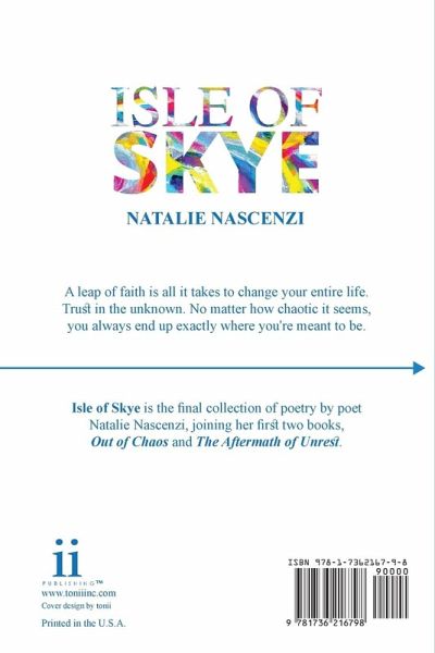 Isle of Skye is the final collection of poetry by Natalie Nascenzi, joining her first two books Out of Chaos and The Aftermath of Unrest. Beginning with her own poetic journey ending, Isle of Skye takes readers through an unpredictable collection of lyrical and emotionally charged poetry-eventually guiding them to a destination and prompting them to write their own beginning. Each piece is different from the next, reflecting the improbability of reality that we each face on every journey through life. Isle of Skye sends the message: Though the road to every goal is highs and lows, we all end up where we are meant to be; and Though an ending is bittersweet, it always means a new beginning.