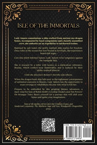 An epic fantasy adventure set in an alternate world of tropical mystery, enchantment, and unique sea dragon lore. Lady Amora commissions a ship crafted from ancient sea dragon bones. Accompanied by loyal companions and a hastily assembled crew, she embarks on an expedition to uncharted realms. Baptised by salt water, the newly sentient ship yearns for freedom. Once ruler of the oceans with mythical powers, but now bound in servitude, she experiences homicidal urges. Cast into shark-infested waters, Lady Amora vows vengeance against the renegade ship. She is rescued by a tribe with access to a miraculous substance, Bounty, which confers near immortality, and is seduced by their idyllic tropical lifestyle. Until she discovers Bounty's horrific side effects. When the dragon bone ship falls prey to the nightmare consequences of unlimited exposure to Bounty, Lady Amora has the opportunity to exact revenge or rehabilitate the one who tried to kill her. Prepare to be enthralled by this gripping fantasy adventure, a must-read for fans of Robin Hobb's Liveship Traders and Tim Powers' On Stranger Tides. Brace yourself for a journey that will chill your bones and ignite your imagination.