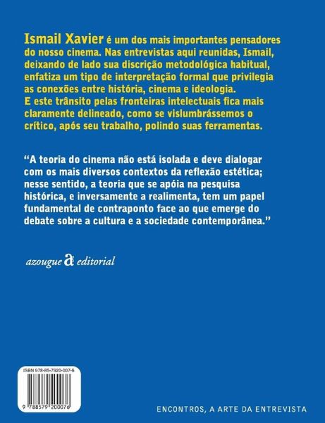 Encontros (Meetings) is the largest and most prestigious book collection of interviews with Brazilian artists and thinkers. With more than 50 published titles, Encontros provides a broad panorama of Brazil's cultural and intellectual wealth. Ismail Xavier is one of the most important researchers of the Brazilian cinema. In the interviews gathered in this book, Ismail, leaving aside his usual methodological discretion, emphasizes a type of formal interpretation that privileges the connections between history, cinema and ideology. And this transit across intellectual frontiers is more clearly delineated, as if we were glimpsing the critic, after his work, polishing his tools.