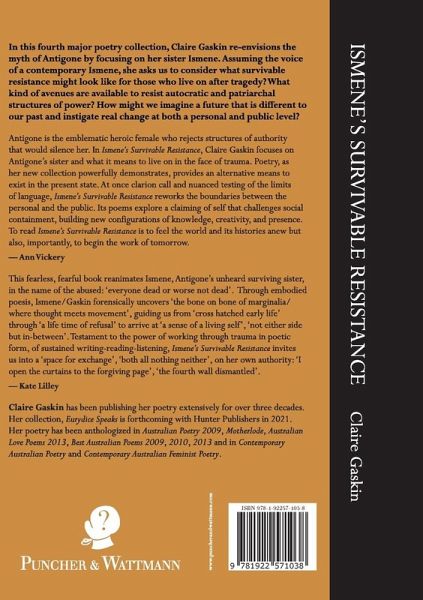 In this fourth major poetry collection, Claire Gaskin re-envisions the myth of Antigone by focusing on her sister Ismene. Assuming the voice of a contemporary Ismene, she asks us to consider what survivable resistance might look like for those who live on after tragedy? What kind of avenues are available to resist autocratic and patriarchal structures of power? How might we imagine a future that is different to our past and instigate real change at both a personal and public level?