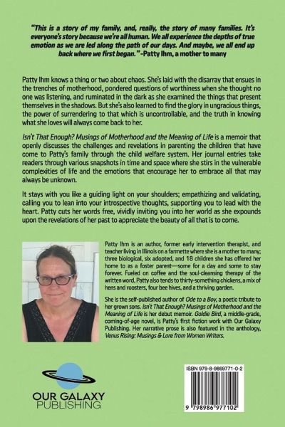 "This is a story of my family, and, really, the story of many families. It's everyone's story because we're all human. We all experience the depths of true emotion as we are led along the path of our days. And maybe, we all end up back where we first began." -Patty Ihm, a mother to many Patty Ihm knows a thing or two about chaos. She's laid with the disarray that ensues in the trenches of motherhood, pondered questions of worthiness when she thought no one was listening, and ruminated in the dark as she examined the things that present themselves in the shadows. But she's also learned to find the glory in ungracious things, the power of surrendering to that which is uncontrollable, and the truth in knowing what she loves will always come back to her. Isn't That Enough? Musings of Motherhood and the Meaning of Life is a memoir that openly discusses the challenges and revelations in parenting the children that have come to Patty's family through the child welfare system. Her journal entries take readers through various snapshots in time and space where she stirs in the vulnerable complexities of life and the emotions that encourage her to embrace all that may always be unknown. It stays with you like a guiding light on your shoulders; empathizing and validating, calling you to lean into your introspective thoughts, supporting you to lead with the heart. Patty cuts her words free, vividly inviting you into her world as she expounds upon the revelations of her past to appreciate the beauty of all that is to come.