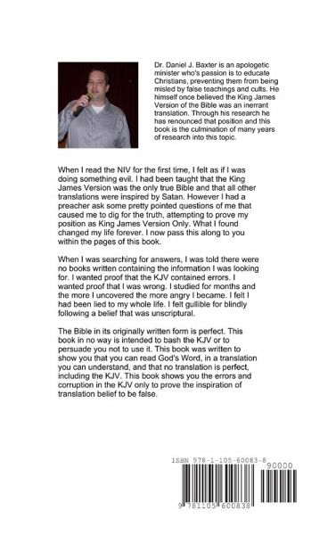 Hard Back Version. This book was not written in effort to bash the Bible or the KJV. This book exposes the problems with the belief of translation inspiration and proves that all translations, including the King James Version, contain errors. After reading this book you will understand how the KJV Only belief came to be and why it is not true, who King James was and why he had the Bible translated, who were the translators and more. This book exposes the errors and corruption inside the KJV as well as the reasoning behind those who hold the KJV Only belief. Inside the pages of this book you will learn questions to ask those who believe the KJV is inerrant or inspired and how to respond to questions those individuals typically ask of those who do not share their belief. This book shows how charts are made to look like modern translations are guilty of many things of which the KJV is also guilty. There is so much information packed into this book you won't want to put it down.