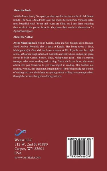 Isn't the Moon lovely? is a poetry collection that has the words of 10 different minds. The book is filled with love; the poems here embrace romance in the most beautiful way! "Some said lovers are blind, but I saw them watching their world in the purest form, for they have their world in themselves." -AyshaShams[poet]