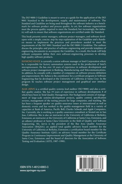 Purpose The purpose of this book is to provide the reader with an understanding of the ISO 9000-3 guideline and how it applies to the specification, development, test, and maintenance of software. We will show that the basic practices and procedures that define software engineering and the ISO guideline are, for all intents and purposes, one and the same. We hope that the readers of this book will use the information found within not only to pass the certification audit but as a tool to be used to create the well-managed engineering environment needed to create reliable, well engineered products in a consistent manner. Audience This book is intended for senior software engineers, software managers, and non software managers within software organizations whose aim is to create an engi neering environment within their company or organization. In addition, individ uals outside the software organization who have responsibility for the specification of the software product and preparing their organization to take ownership of the developed product will find this book of great interest. Finally, those who must choose software companies to do business with or audit software companies to determine their ability to engineer and maintain a software product will find this book helpful. 2 Introduction Overview This book is made up of twenty-four chapters that can be grouped into four sections. Chapter 1 through Chapter 4 set the basis for the following chapters that deal directly with the guideline.