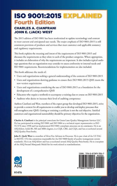 The 2015 edition of ISO 9001 has been modernized to update terminology and content to meet current and anticipated user needs. The major emphasis of ISO 9001:2015 is still consistent provision of products and services that meet customer and applicable statutory and regulatory requirements. This book explains the meaning and intent of the requirements of ISO 9001:2015 and discusses the requirements as they relate to each of the product categories. Where appropriate, it includes an elaboration of why the requirements are important. It also includes typical audit-type questions that an organization may consider to assess conformity to internal needs and ISO 9001 requirements. Recommendations for implementation are also included. This book addresses the needs of: Users and organizations seeking a general understanding of the contents of ISO 9001:2015 Users and organizations desiring guidance to ensure their ISO 9001:2015 QMS meets the new version requirements Users and organizations considering the use of ISO 9001:2015 as a foundation for the development of a comprehensive QMS Educators who require a textbook to accompany a training class or course on ISO 9001:2015 Auditors who desire to increase their level of auditing competence Authors Cianfrani and West, members of the expert group that developed ISO 9001:2015, strive to provide a context for all requirements to enable you to develop and deploy processes that will strengthen your QMS. Getting or retaining a certificate is not the real objective. Satisfied customers and organizational sustainability should be primary objectives for the organization.