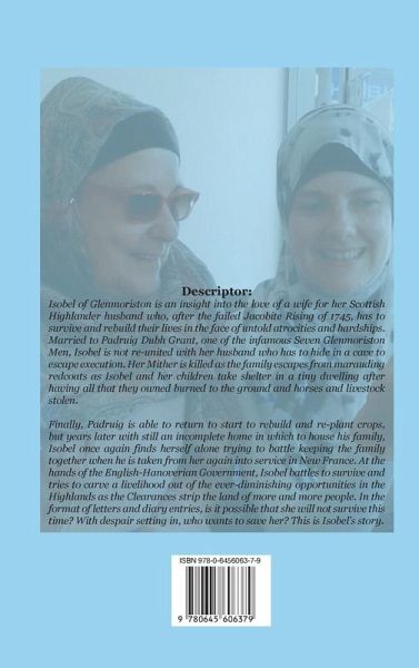 A historical fiction compilation in the form of letters and diary entries, where in the 18th Century Scottish Highlands, all around Isobel is death, rape and burning fires, her Mother is lost as well as her home and livelihood. Isobel takes shelter in a shieling with her three children and her grieving father in the aftermath of Culloden. Her soldier husband Padruig Dubh, in escaping execution, leaves the family to fend for themselves while living in Coiraghoth cave as one of the Seven Glenmoriston Men. Their farm is burned down as well as their crops and the cows and Clydesdale horses are stolen. Years go by and eventually she begins to see crops replanted and a new home partially built, but once again her beloved husband is taken from her and forced into military service for the British in a foreign land. Finally, despair sets in. Losing her husband, along with all the secrets that she has kept all this time, becomes too much to bear. Will she let new love save her? This is Isobel's story.