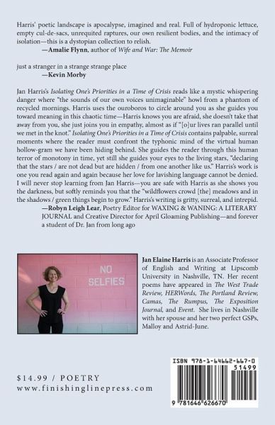 Harris' poetic landscape is apocalypse, imagined and real. Full of hydroponic lettuce, empty cul-de-sacs, unrequited raptures, our own resilient bodies, and the intimacy of isolation-this is a dystopian collection to relish. -Amalie Flynn, author of Wife and War: The Memoir just a stranger in a strange strange place -Kevin Morby Jan Harris's Isolating One's Priorities in a Time of Crisis reads like a mystic whispering danger where "the sounds of our own voices unimaginable" howl from a phantom of recycled mornings. Harris uses the ouroboros to circle around you as she guides you toward meaning in this chaotic time-Harris knows you are afraid, she doesn't take that away from you, she just joins you in empathy, almost as if "[o]ur lives ran parallel until we met in the knot." Isolating One's Priorities in a Time of Crisis contains palpable, surreal moments where the reader must confront the typhonic mind of the virtual human hollow-gram we have been hiding behind. She guides the reader through this human terror of monotony in time, yet still she guides your eyes to the living stars, "declaring that the stars / are not dead but are hidden / from one another like us." Harris's work is one you read again and again because her love for lavishing language cannot be denied. I will never stop learning from Jan Harris-you are safe with Harris as she shows you the darkness, but softly reminds you that the "wildflowers crowd [the] meadows and in the shadows / green things begin to grow." Harris's writing is gritty, surreal, and intrepid. -Robyn Leigh Lear, Poetry Editor for WAXING & WANING: A LITERARY JOURNAL and Creative Director for April Gloaming Publishing-and forever a student of Dr. Jan from long ago