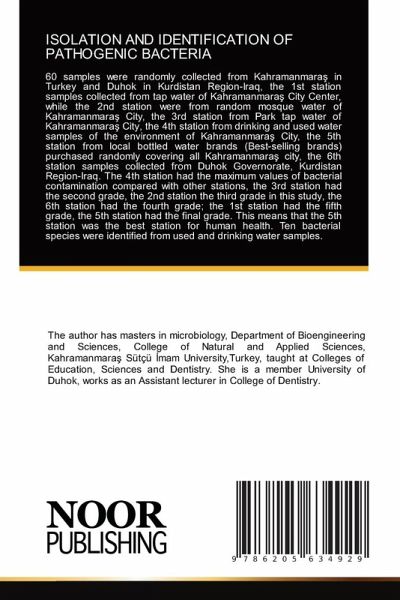60 samples were randomly collected from Kahramanmaras in Turkey and Duhok in Kurdistan Region-Iraq, the 1st station samples collected from tap water of Kahramanmaras City Center, while the 2nd station were from random mosque water of Kahramanmaras City, the 3rd station from Park tap water of Kahramanmaras City, the 4th station from drinking and used water samples of the environment of Kahramanmaras City, the 5th station from local bottled water brands (Best-selling brands) purchased randomly covering all Kahramanmaras city, the 6th station samples collected from Duhok Governorate, Kurdistan Region-Iraq. The 4th station had the maximum values of bacterial contamination compared with other stations, the 3rd station had the second grade, the 2nd station the third grade in this study, the 6th station had the fourth grade; the 1st station had the fifth grade, the 5th station had the final grade. This means that the 5th station was the best station for human health. Ten bacterial species were identified from used and drinking water samples.