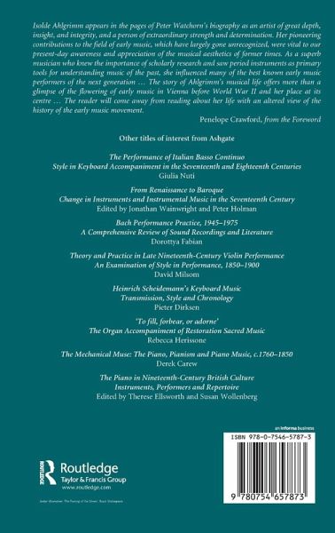 Isolde Ahlgrimm (1914-1995) was an important pioneer in the revival of Baroque and Classical keyboard instruments in her native city, Vienna, and later, throughout Europe and the United States. She trained as a pianist at the Musikakademie in Vienna under the instruction of Viktor Ebenstein, Emil von Sauer and Franz Schmidt. In 1934 she met the musical instrument collector, Dr Erich Fiala, whom she married in 1938. His activities opened up the world of early instruments to her. Using a 1790 fortepiano by Michael Rosenberger, Isolde Ahlgrimm began her career as a specialist on early keyboard instruments with the first in her notable series of Concerte für Kenner und Liebhaber, given in Vienna's Palais Palffy in February 1937. Ahlgrimm's career as a harpsichordist also began in 1937, when a new instrument was commissioned from the Ammer brothers in Eisenberg, Germany. In 1943 Ahlgrimm performed her first all-harpsichord programme, which consisted of the Goldberg Variations by J.S. Bach. From 1949 to 1956, she devoted herself to performing and recording nearly all of Bach's harpsichord music for the newly-founded Dutch label, Philips, presenting her new approach to the harpsichord to a wider audience. Ahlgrimm's performances of Baroque music represented a radical departure from the distinctly twentieth-century interpretations by the much more famous Wanda Landowska and her followers. Most obviously, Ahlgrimm's harpsichord performances eliminated frequent registration changes (her instrument had hand stops rather than pedals to change registers), and largely eschewed the massive ritardandi and other anachronistic performance practices that were hallmarks of Landowska's essentially Romantic style. Ahlgrimm researched and emphasized rhetorical traditions on which the music was based. This became more pronounced throughout the course of her later performing, writing and teaching career, and it was the beginning of an approach to the performance of eighteenth-century music which was later further developed by Gustav Leonhardt, Nikolaus Harnoncourt and their students. Peter Watchorn provides an engaging study of this pioneer, and argues that Isolde Ahlgrimm's contribution to the harpsichord and fortepiano revival was pivotal, and that her use of period instruments and the inspiration she instilled in younger musicians, including Nikolaus Harnoncourt and Gustav Leonhardt, has been almost entirely overlooked by the wider musical world.