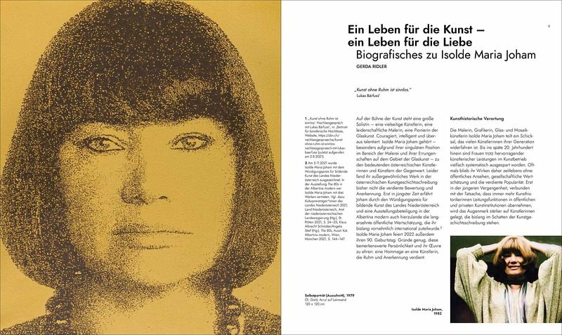 Isolde Maria Joham (_1932) gilt als Pionierin der Glaskunst, die sie mit Feingefühl und technischer Brillanz stets weiterentwickelt hat. Ihre monumentalen Leinwandarbeiten können es souverän mit der von Männern dominierten Pop-Art aufnehmen. In ihrer fotorealistischen Malerei geht sie schonungslos den drängenden Fragen ihrer Zeit nach.