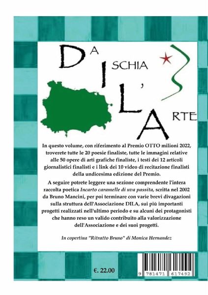 In questo volume, con riferimento al Premio OTTO milioni 2022, troverete tutte le 20 poesie finaliste, tutte le immagini relative alle 50 opere di arti grafiche finaliste, i testi dei 12 articoli giornalistici finalisti e i link dei 10 video di recitazione finalisti della undicesima edizione del Premio. A seguire potrete leggere una sezione comprendente l'intera raccolta poetica "Incarto caramelle di uva passita", scritta nel 2002 da Bruno Mancini, per poi terminare con varie brevi divagazioni sulla struttura dell'Associazione DILA, sui più importanti progetti realizzati nell'ultimo periodo e su alcuni dei protagonisti che hanno reso un valido contribuito alla valorizzazione dell'Associazione e dei suoi progetti.