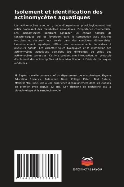 Les actinomycètes sont un groupe d'organismes physiologiquement très actifs produisant des métabolites secondaires d'importance commerciale. Les actinomycètes semblent posséder un certain nombre de caractéristiques qui les favorisent dans la compétition avec d'autres microbes et assurent leur survie dans des conditions défavorables. L'environnement aquatique diffère des environnements terrestres à plusieurs égards. Les caractéristiques biologiques et la distribution des actinomycètes aquatiques devraient être différentes de celles des actinomycètes terrestres. Ce livre contient une introduction, un protocole d'isolement des actinomycètes et leur identification à l'aide de techniques modernes.