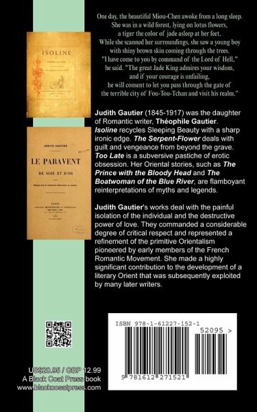 Judith Gautier (1845-1917) was the daughter of the great Romantic writer, Théophile Gautier. Isoline features an extraordinary heroine and recycles Sleeping Beauty with a sharp ironic edge. The Serpent-Flower deals with guilt and vengeance from beyond the grave. Too Late is a subversive pastiche of hallucinatory erotic obsession. Her Oriental stories, such as The Prince with the Bloody Head and The Boatwoman of the Blue River, are flamboyant reinterpretations of myths and legends. Judith Gautier's works deal with the painful isolation of the individual and the destructive power of love. They commanded a considerable degree of critical respect and represented a refinement of the primitive Orientalism pioneered by early members of the French Romantic Movement. She made a highly significant contribution to the development of a literary Orient that was subsequently exploited by many later writers.