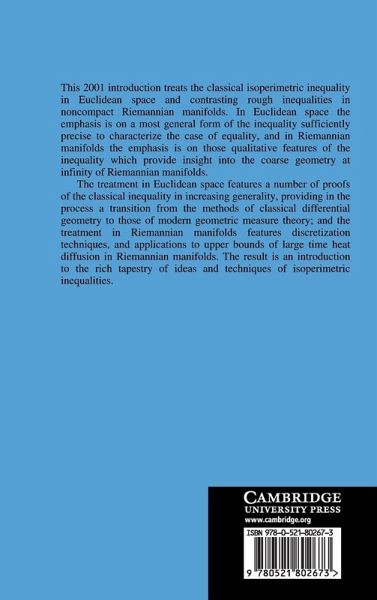 This introduction treats the classical isoperimetric inequality in Euclidean space and contrasting rough inequalities in noncompact Riemannian manifolds. In Euclidean space the emphasis is on a most general form of the inequality sufficiently precise to characterize the case of equality, and in Riemannian manifolds the emphasis is on those qualitative features of the inequality which provide insight into the coarse geometry at infinity of Riemannian manifolds. The treatment in Euclidean space features a number of proofs of the classical inequality in increasing generality, providing in the process a transition from the methods of classical differential geometry to those of modern geometric measure theory; and the treatment in Riemannian manifolds features discretization techniques, and applications to upper bounds of large time heat diffusion in Riemannian manifolds. The result is an introduction to the rich tapestry of ideas and techniques of isoperimetric inequalities.