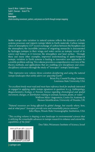 Stable isotope ratio variation in natural systems reflects the dynamics of Earth systems processes and imparts isotope labels to Earth materials. Carbon isotope ratios of atmospheric CO2 record exchange of carbon between the biosphere and the atmosphere; the incredible journeys of migrating monarchs is documented by hydrogen isotopes in their wings; and water carries an isotopic record of its source and history as it traverses the atmosphere and land surface. Through these and many other examples, improved understanding of spatio-temporal isotopic variation in Earth systems is leading to innovative new approaches to scientific problem-solving. This volume provides a comprehensive overview of the theory, methods, and applications that are enabling new disciplinary and cross-disciplinary advances through the study of "isoscapes": isotopic landscapes.