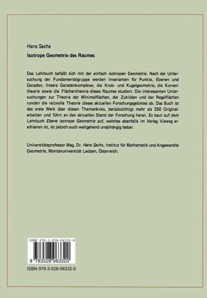 Der allgemeine Begriff der m-dimensionalen isotropen Mannigfaltigkeit Vm eines kom plexen euklidischen Rn wurde von J. LENSE gepragt und fiihrte zu einer Reihe aufier ordentlich interessanter Untersuchungen (vgl. [92J - [104]). Spater hat M. PINL (vgl. [138J - [160]) diese Thematik unter Aspekten der Riemannschen Geometrie konsequent weiterentwickelt. 1st x = x( Ul, U2, . . ,u ) eine m-dimensionale Riemannsche Mannig m faltigkeit Vm, die in einem komplexen eukHdischen Rn(Xl;·· . ,xn) eingebettet ist und bezeichnet 8x (0. 1) 8u{3 ihren Mafitensor, so heifit Vm isotrop vom Rang r, wenn Rang (gcx{3) = r m gerne Vm als (m-r)-fach isotrop bezeich net. Speziell fiir r = 0, d. h. g"'{3 == 0 liegen sogenannnte vollisotrope Mannigfaltigkeiten vor, denn fiir das allgemeine Bogenelementquadrat (0. 2) 2 gilt hier ds == o. Diese vollisotropen Mannigfaltigkeiten wurden nicht nur von J. LENSE und M. PINL sondern auch von E. BOMPIANI (vgl. [13J - [17]) studiert. Allgemeine Einbettungsprobleme isotroper Mannigfaltigkeiten in regulare Riemannsche Raume hat vor allem W. O. VOGEL behandelt (vgl. [250J - [254]). Eine zusammen fassende Darstellung iiber den bisher angesprochenen Themenkomplex wird unabhangig von diesem Buch in Form einer Monographie von W. O. VOGEL publiziert werden.