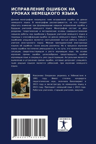 Dannaq monografiq poswqschena teme isprawleniq oshibok na urokah nemeckogo qzyka. V monografii rassmatriwaetsq, na chto sleduet obratit' wnimanie pri formirowanii nawykow isprawleniq oshibok u buduschih uchitelej nemeckogo qzyka. Monografiq sostoit iz dwuh razdelow: teoreticheskie i metodicheskie osnowy sowershenstwowaniq nawykow raboty nad oshibkami u buduschih uchitelej nemeckogo qzyka i podhody k klassifikacii oshibok na urokah nemeckogo qzyka. Rabota s oshibkami uchaschihsq qwlqetsq neot#emlemoj chast'ü raboty kazhdogo uchitelq inostrannogo qzyka. Mneniq prepodawatelej inostrannyh qzykow ob oshibkah takzhe wes'ma razlichny. No w processe izucheniq qzyka oshibki postepenno umen'shaütsq, i, po suti, äto polozhitel'naq situaciq, swidetel'stwuüschaq o roste izuchaüschih qzyk. Na osnowe izucheniq prichin oshibok celesoobrazno predotwraschat' oshibki izuchaüschih qzyk i sokraschat' uzhe suschestwuüschie. Aktual'nym qwlqetsq wyqwlenie i ustranenie prichin oshibok, kotorye dopuskaüt uchaschiesq, ch'im rodnym qzykom qwlqetsq uzbexkij, pri izuchenii nemeckogo qzyka.