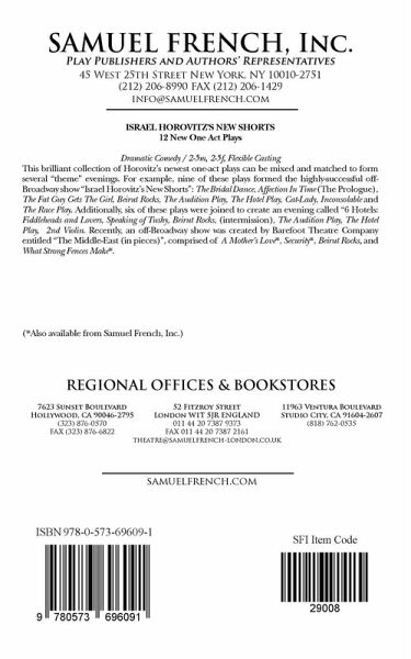 Dramatic Comedy / Flexible casting: 2-5m, 2-5f This brilliant collection of Horovitz's newest one-act plays can be mixed and matched to form several "theme" evenings. For example, nine of these plays formed the highly-successful off-Broadway show "Israel Horovitz's New Shorts" The Bridal Dance, Affection In Time (The Prologue), The Fat Guy Gets The Girl, Beirut Rocks, The Audition Play, The Hotel Play, Cat-Lady, Inconsolable and The Race Play . Additionally, six of these plays were joined to c