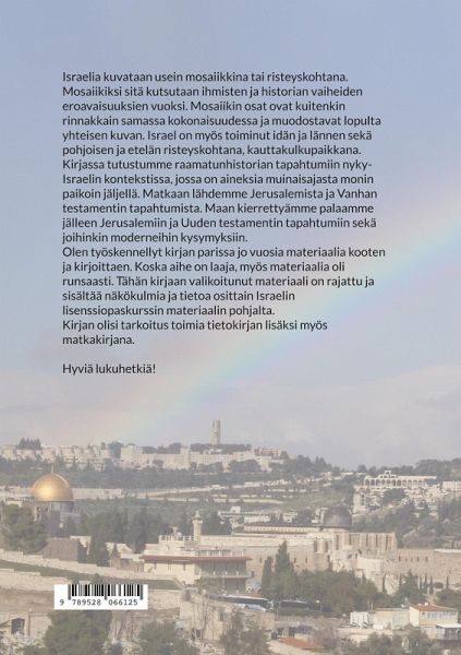 Israelia kuvataan usein mosaiikkina tai risteyskohtana. Mosaiikiksi sitä kutsutaan ihmisten ja historian vaiheiden eroavaisuuksien vuoksi. Mosaiikin osat ovat kuitenkin rinnakkain samassa kokonaisuudessa ja muodostavat lopulta yhteisen kuvan. Israel on myös ollut idän ja lännen sekä pohjoisen ja etelän risteyskohta ja kauttakulkupaikka. Kirjassa tutustumme raamatunhistorian tapahtumiin nyky-Israelin kontekstissa, jossa muinaisajan kaikuja on monin paikoin on yhä havaittavissa. Matkaan lähdemme Jerusalemista ja Vanhan testamentin tapahtumista. Kierrämme Negevin ja keski-Israelin kautta pohjoiseen Galileaan palaamme lopuksi Jerusalemiin. Matkan edetessä myös siirrymme Vanhan testamentin tapahtumista Uuden testamentin tapahtumiin. Olen työskennellyt kirjan parissa jo vuosia materiaalia kooten ja kirjoittaen. Koska aihe on laaja, myös materiaalia oli runsaasti. Tähän kirjaan valikoitunut materiaali on rajattu ja sisältää näkökulmia ja tietoa osittain Israelin lisenssiopaskurssin materiaalin pohjalta. Kirjan olisi tarkoitus toimia tietokirjan lisäksi myös matkakirjana. Hyviä lukuhetkiä!