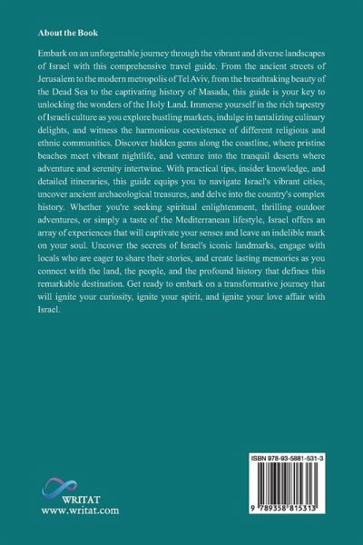 Embark on an unforgettable journey through the vibrant and diverse landscapes of Israel with this comprehensive travel guide. From the ancient streets of Jerusalem to the modern metropolis of Tel Aviv, from the breathtaking beauty of the Dead Sea to the captivating history of Masada, this guide is your key to unlocking the wonders of the Holy Land. Immerse yourself in the rich tapestry of Israeli culture as you explore bustling markets, indulge in tantalizing culinary delights, and witness the harmonious coexistence of different religious and ethnic communities. Discover hidden gems along the coastline, where pristine beaches meet vibrant nightlife, and venture into the tranquil deserts where adventure and serenity intertwine. With practical tips, insider knowledge, and detailed itineraries, this guide equips you to navigate Israel's vibrant cities, uncover ancient archaeological treasures, and delve into the country's complex history. Whether you're seeking spiritual enlightenment, thrilling outdoor adventures, or simply a taste of the Mediterranean lifestyle, Israel offers an array of experiences that will captivate your senses and leave an indelible mark on your soul. Uncover the secrets of Israel's iconic landmarks, engage with locals who are eager to share their stories, and create lasting memories as you connect with the land, the people, and the profound history that defines this remarkable destination. Get ready to embark on a transformative journey that will ignite your curiosity, ignite your spirit, and ignite your love affair with Israel.