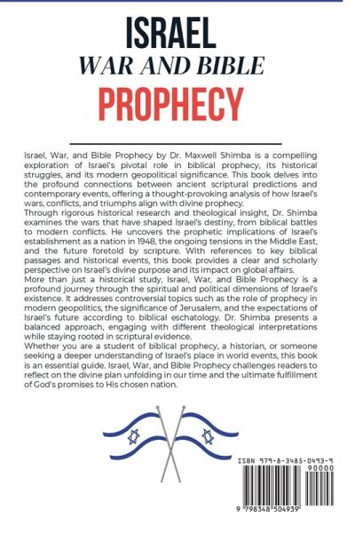 Israel, War, and Bible Prophecy Israel, War, and Bible Prophecy by Dr. Maxwell Shimba is a compelling exploration of Israel's pivotal role in biblical prophecy, its historical struggles, and its modern geopolitical significance. This book delves into the profound connections between ancient scriptural predictions and contemporary events, offering a thought-provoking analysis of how Israel's wars, conflicts, and triumphs align with divine prophecy. Through rigorous historical research and theological insight, Dr. Shimba examines the wars that have shaped Israel's destiny, from biblical battles to modern conflicts. He uncovers the prophetic implications of Israel's establishment as a nation in 1948, the ongoing tensions in the Middle East, and the future foretold by scripture. With references to key biblical passages and historical events, this book provides a clear and scholarly perspective on Israel's divine purpose and its impact on global affairs. More than just a historical study, Israel, War, and Bible Prophecy is a profound journey through the spiritual and political dimensions of Israel's existence. It addresses controversial topics such as the role of prophecy in modern geopolitics, the significance of Jerusalem, and the expectations of Israel's future according to biblical eschatology. Dr. Shimba presents a balanced approach, engaging with different theological interpretations while staying rooted in scriptural evidence. Whether you are a student of biblical prophecy, a historian, or someone seeking a deeper understanding of Israel's place in world events, this book is an essential guide. Israel, War, and Bible Prophecy challenges readers to reflect on the divine plan unfolding in our time and the ultimate fulfillment of God's promises to His chosen nation.