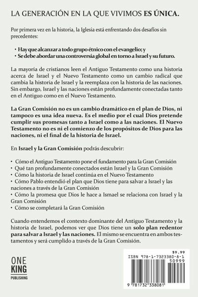 La generación en la que vivimos es unica.Por primera vez en la historia, la Iglesia está enfrentando dos desafíos sin precedentes:Hay que alcanzar a todo grupo étnico con el evangelio; y Se debe abordar una controversia global en torno a Israel y su futuro. La mayoría de cristianos leen el Antiguo Testamento como una historia acerca de Israel y el Nuevo Testamento como un cambio radical que cambia la historia de Israel y la reemplaza con la historia de las naciones. Sin embargo, Israel y las naciones están profundamente conectadas tanto en el Antiguo como en el Nuevo Testamento.La Gran Comisión no es un cambio dramático en el plan de Dios, ni tampoco es una idea nueva. Es el medio por el cual Dios pretende cumplir sus promesas tanto a Israel como a las naciones. El Nuevo Testamento no es ni el comienzo de los propósitos de Dios para las naciones, ni el final de la historia de Israel.En Israel y la Gran Comisión podrás descubrir:Cómo el Antiguo Testamento pone el fundamento para la Gran Comisión Qué tan profundamente conectados están Israel y la Gran Comisión Cómo la historia de Israel continúa en el Nuevo Testamento Cómo Pablo entendió el plan que Dios tiene para salvar a Israel y las naciones a través de la Gran Comisión Cómo se completará la Gran Comisión Cuando entendemos el contexto dominante del Antiguo Testamento y la historia de Israel, podemos ver que Dios tiene un solo plan redentor para salvar a Israel y las naciones. El mismo se encuentra en ambos testamentos y será cumplido a través de la Gran Comisión.
