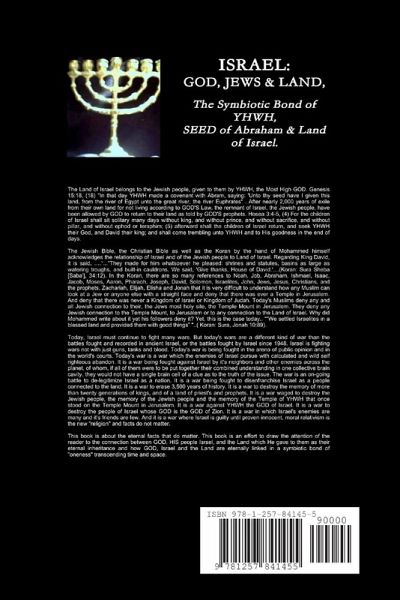 The Land of Israel belongs to Israel, given to them by GOD YHWH. Hebrew & Christian Bibles & Koran state this truth but is denied by Arab Christians and Muslims. Genesis 15:18,"Unto thy SEED have I given this Land". Koran:Sura 10:89 "We settled Israelites in a blessed land and provided them with good things" & Sura 34:12 "We said, give thanks House of David" & Sura 5:21 about Moses & Israel, "Enter my people, the holy land which Allah has assigned for you". After 2,000 years of exile, Israel returned to their Land only to fight wars and wars of public opinion. Jews are denied any connection to the Land. They attempt to de-legitimize and disenfranchise the Jewish people and to erase any memory of 3,500 years of Jewish existence on the Land by changing names of cities, burial tombs, holy places to destroying historical and archaeological sites. They are literally trying to erase Israel's history. This book is about the eternal bond between GOD, HIS people Israel and the Land.