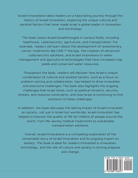 Israeli Innovations takes readers on a fascinating journey through the history of Israeli innovation, exploring the unique cultural and societal factors that have made Israel a global leader in innovation and technology. The book covers Israeli breakthroughs in various fields, including healthcare, cybersecurity, agriculture, and transportation. For example, readers will learn about the development of revolutionary cancer treatments like CAR-T therapy, the creation of advanced cybersecurity solutions, and Israeli innovations in water management and agricultural technologies that have increased crop yields and conserved water resources. Throughout the book, readers will discover how Israel's unique combination of cultural and societal factors, such as a focus on problem-solving and collaboration, has helped to drive innovation and overcome challenges. The book also highlights the ongoing challenges that Israel faces, such as political tensions, security threats, and resource constraints, and how Israel is continuing to find solutions to these challenges. In addition, the book discusses the lasting impact of Israeli innovation on society, not just in Israel but worldwide. Israeli innovation has helped to improve the quality of life for millions of people around the world, from life-saving medical treatments to sustainable transportation solutions.