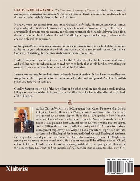 Israel's Intrepid Warrior: The Dauntless Courage of Samson is a distinctively powerful and suspenseful narrative on Samson. At this time, because of Israel's disobedience, God had allowed this nation to be mightily chastised by the Philistines. However, when they turned from their sins and asked Him for help, His incomparable compassion responded quickly. God called Samson and equipped him with supernatural strength. This narrative dramatically shows, in graphic scenery, how this strongman single-handedly delivered Israel from the domination of the Philistines. And with his display of supernatural strength, he became the one and only real life superman. As the Spirit of God moved upon Samson, his heart was stirred to travel to the land of the Philistines, for he was in great admiration of the Philistine women. And he met several women. But this was God's way of agitating the Philistines to begin the deliverance of Israel. Finally, Samson met a young maiden named Delilah. And his deep love for her became his downfall. And with her deceitful seduction, she enticed him relentlessly, that he told her the secret of his great strength. Then, she betrayed him to the lords of the Philistines. Samson was captured by the Philistines and used a beast of burden. At last, he was placed between two pillars of the temple to perform. But he turned to the Lord and prayed. And God heard his prayer and restored his strength. Quickly, Samson took hold of the two pillars and pushed until the temple came crashing down killing more enemies of the Philistines than he had killed in all his life. And he killed all of the lords of the Philistines.