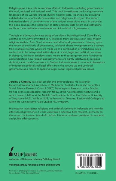Religion plays a key role in everyday affairs in Indonesia—including governance at the local, regional and national level. This book investigates local governance landscape of the world's largest Muslim majority state, Indonesia, and its local governance landscape by providing a detailed account of local communities and religious authority on the eastern Indonesian island of Lombok—one of the nation's most pious areas. In particular, this book considers the interaction of state and non-state actors and institutions and how these institutions are interwoven into a fabric of governance. Through an ethnographic case study of a an Islamic boarding school, Darul Falah, and the community committed to it, this book trains its focus upon local Muslim religious leaders (Tuan Guru) who are central to local governance. Drawing upon the notion of the fabric of governance, this book shows how governance is woven from multiple strands which are made up of a combination of institutions, rules and actors to be interpreted within dynamic social, legal and political processes. In doing so, this book employs a new means to theorise governance frameworks and understand how religion and governance are tightly intertwined. Religious Authority and Local Governance in Eastern Indonesia seeks to re-orient discussions of Indonesian political and legal affairs from the ground up and use local governance as a means to speak to larger social, legal and political issues.