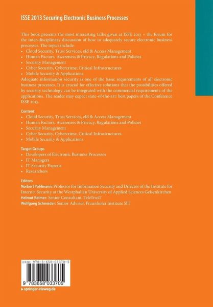 Adequate information security is one of the basic requirements of all electronic business processes. It is crucial for effective solutions that the possibilities offered by security technology can be integrated with the commercial requirements of the applications. The reader may expect state-of-the-art: best papers of the Conference ISSE 2013.